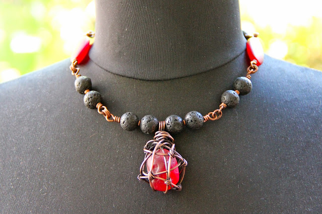 Then I tried another technique by Brenda Schweder in Essential Wirework Techniques, on Craftsy again, the Tissue Capture, I captured a piece of cultured sea glass in a wire cage, oxidized and sealed it. I even made a necklace with it.