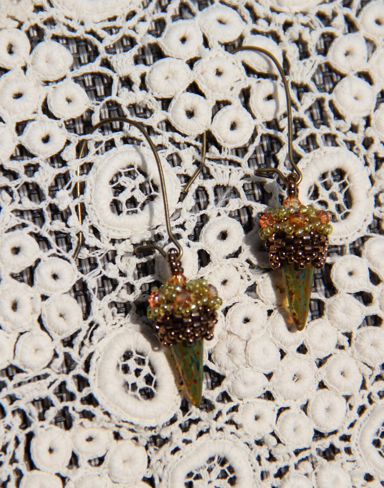 Et pour aller avec, pourquoi pas des boucles d'oreilles tissées à partir de "spikes" d'après un modèle de Helena Tang-Lim (Maneklady)