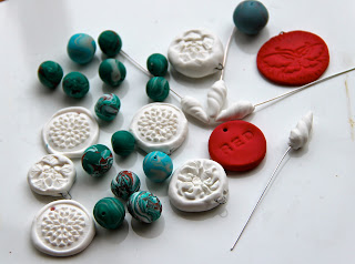 I started with a little polymer clay, this time the rustic elements, I'm following Ginger Davis Allman 's tutorial, will have a white clay basis. I also made a few beads with some of Lou's leftovers. They might come in handy one day.