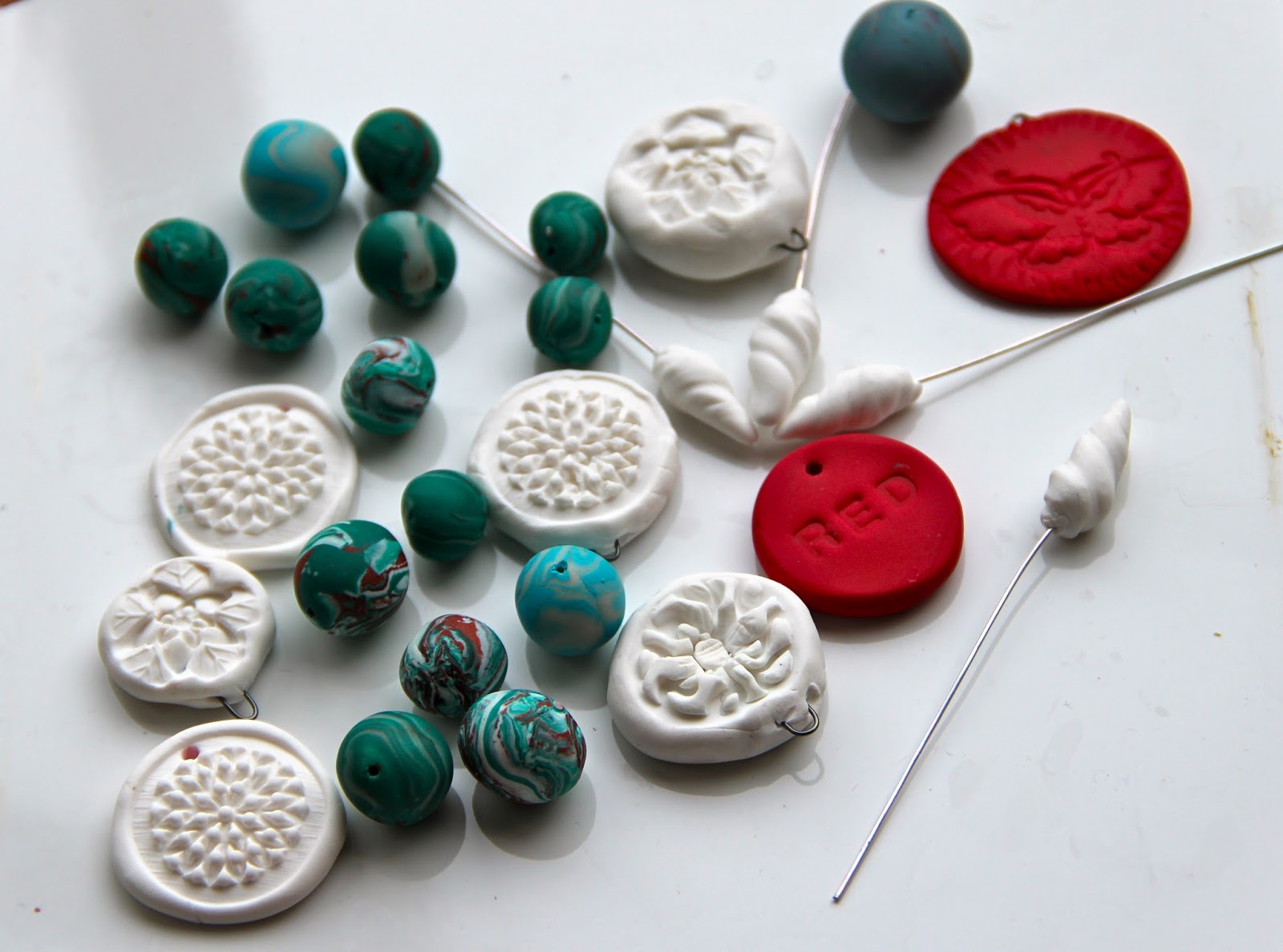 Un petit peu de pâte polymère, cette fois les éléments à fabriquer selon le tuto de Ginger Davis Allman sont à base de pâte blanche, j'ai aussi fait quelques perles avec les restes que Lou avait laissés. On verra bien, ça peut toujours servir.