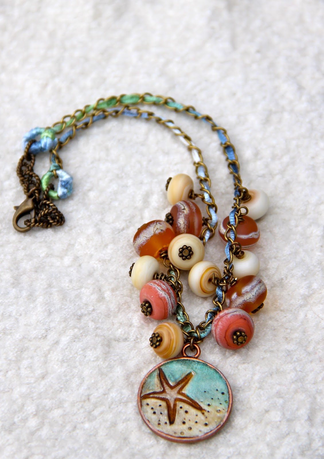 From a three strand necklace with chain, leather, silk and beads, but too complicated, to this one much simpler, maybe not totally reflecting the painting but where I see the sunny colors and the water, however discreetly.