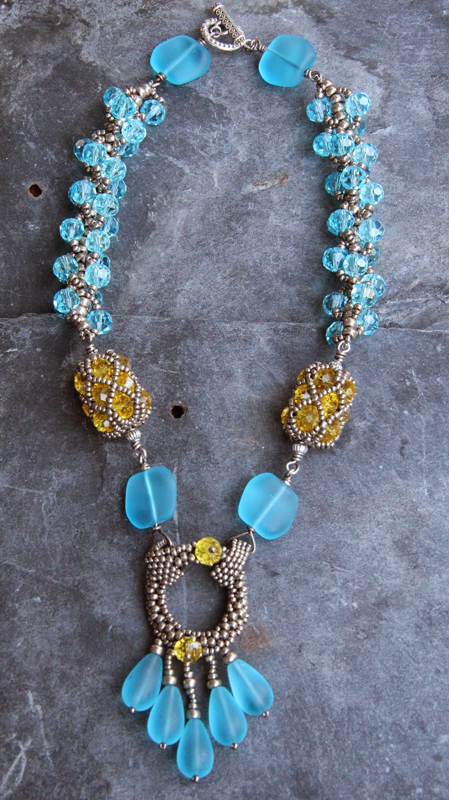 4. An amazing variety of designs. Love the netting in your first necklace. I also like the multi-strand necklace with the lamp work bead.