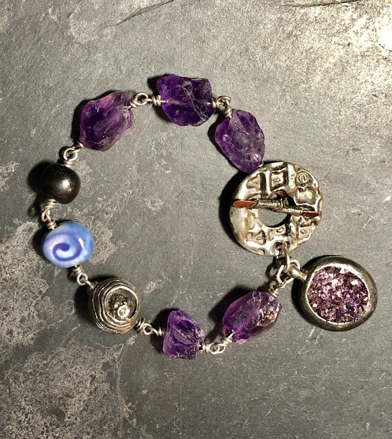 RépondreSupprimerThis was a really tempting challenge but I knew I wouldn't be able to keep up :) I do hope that you will be inspired to just go on creating, your jewelry is so unique and special! I love that bracelet with raw (fluorite or amethyst?) beads and the gunmetal necklace with the quartz crystals (?) below it!