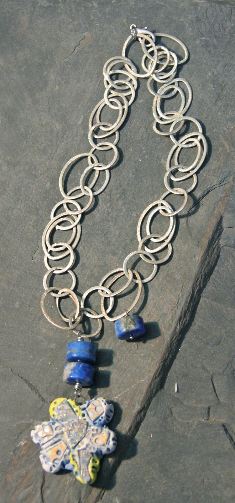 I kept it simple, I kept Mary Harding's pendant, added three stones and some chain bought in Portugal. Multiple big links.