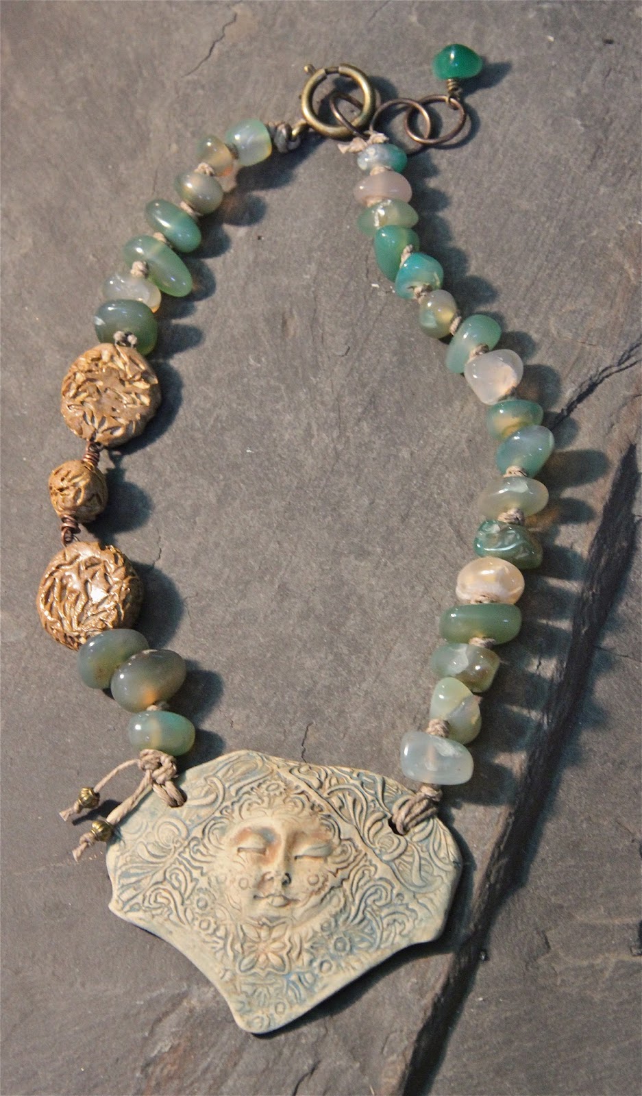 I had gathered beads for a week and I didn't know how to assemble them. I had tried leather, linen, cotton, knotted or not. There was always something wrong either with the diameter of the cord or of the bead hole. That's the problem with big beads.