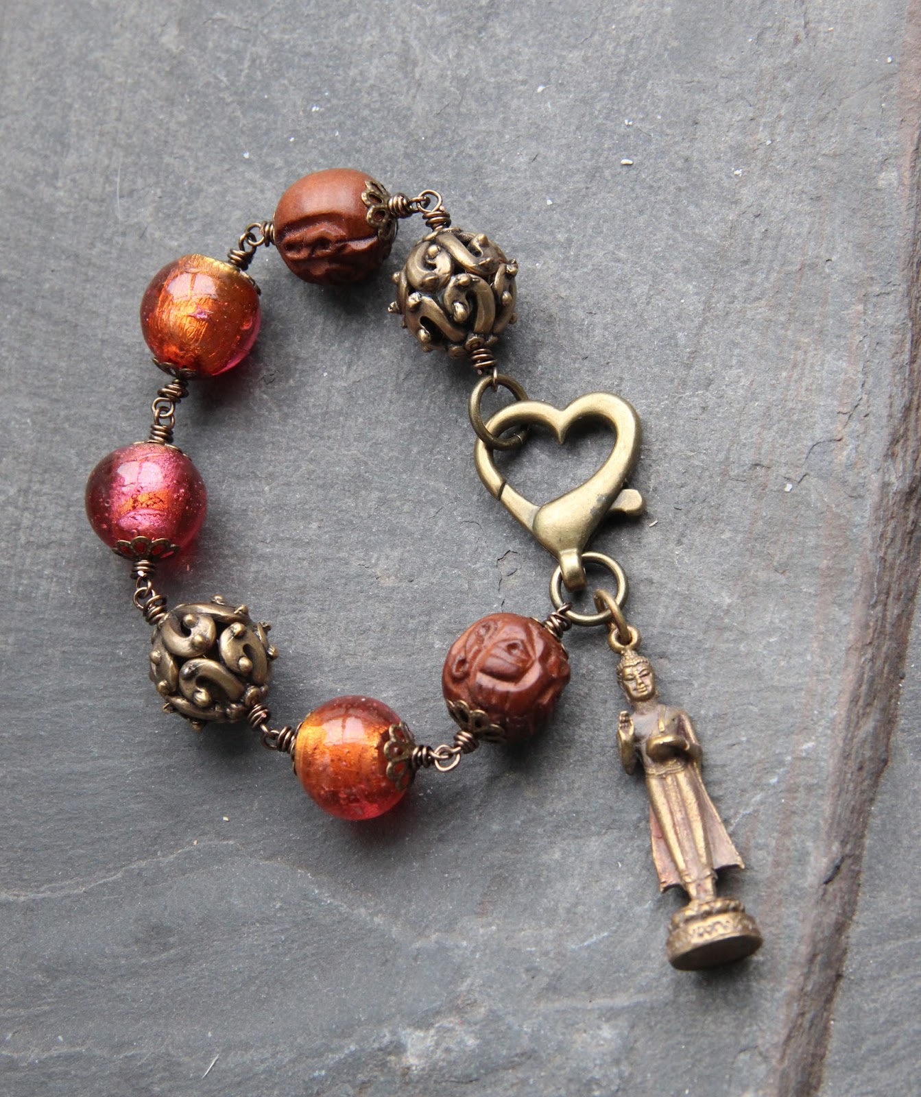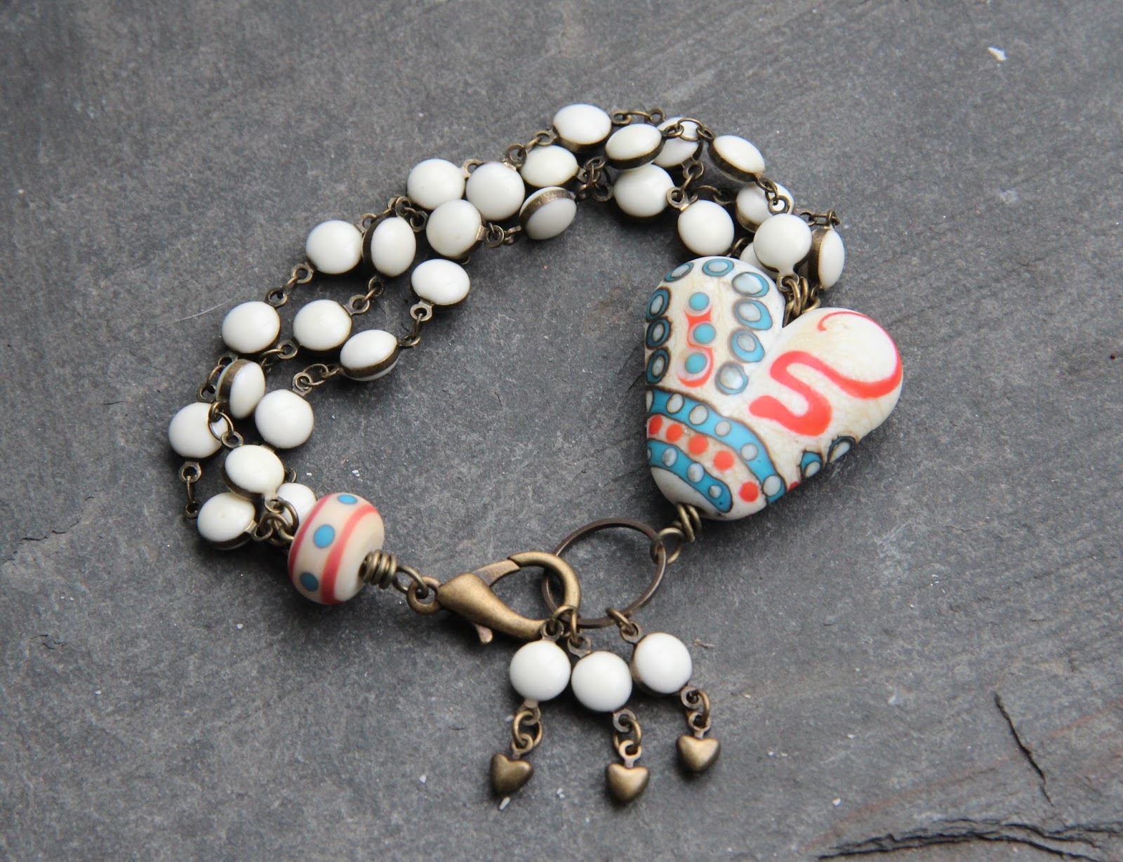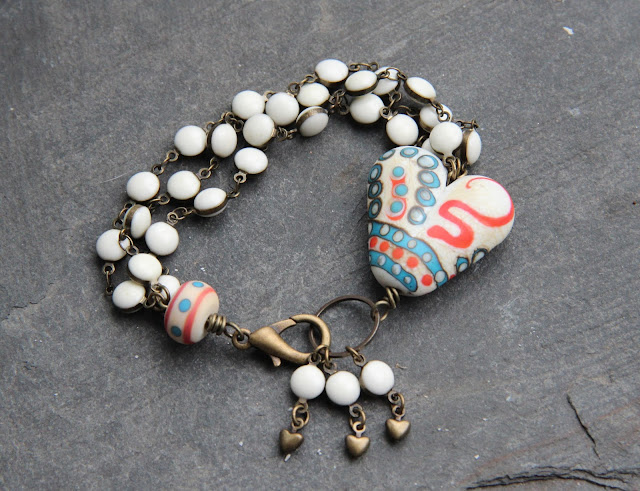 That's the end of the delicate version of my bracelet but a great mix of all kinds of materials in the colors of the inspiration: linen, metal, glass, ceramic, stones, crystal.