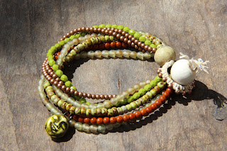Round pressed glass beads, fire polished beads I took with me, metal seed beads, and Gaea handmade ceramic beads.