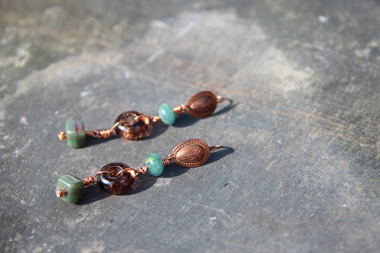 And here is what I made right away, earrings with Happy Fish pendants, jasper beads and Curious glass beads on bronze wire.