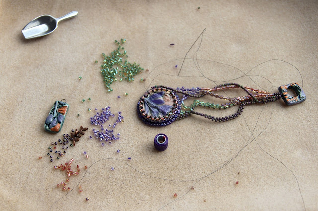 I took back a freeform peyote weaving in progress that I started from a cabochon and a clasp by Mary Harding.