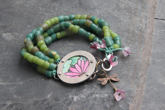 J'ai commencé avec cette perle au macareux à laquelle je n'avais pu résister et j'ai choisi un fermoir de Mary Harding. Toutes les autres perles sont des perles en verre et céramique liées par du lin ciré.